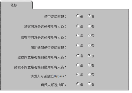 設定及限制簽核種類,例如:准/不准、同意/不同意、會辦處理、通知等。