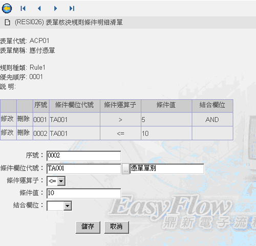 • 表單核決規則條件明細清單: