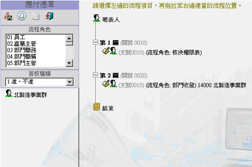 如此當表流程解析時,會依條件欄位TA001之憑單單別判斷該簽核至那一等級的主管,而最後一關為文管中心收發,也就是說核決權限這個流程角色前後還可加入其他流程角色以增加彈性。