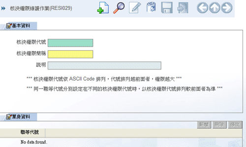 • 當表單流程需要使用到核決權限表時,可透過本程式將所需之核決權限代號建立好,建立時請注意,核決權限代號依 ASCII Code 排列,代號排列越前面者,權限越大。